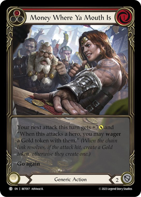 Your next attack this turn gets +3POWER and "When this Attacks a hero, you may wager a Gold token with them." (When the chain link resolves, if the attack hit, you create a Gold token, otherwise they create one.)
