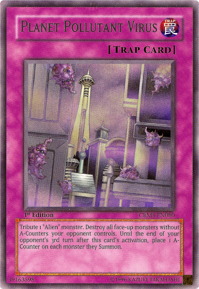 Tribute 1 "Alien" monster. Destroy all face-up monster without A-Counters your opponent controls. Untill the end of your opponent's 3rd turns after this card's activation, place 1 A-Counter on each monster they Summon.