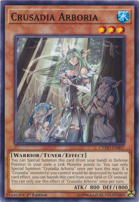 You can Special Summon this card (from your hand) in Defense Position to your zone a Link Monster points to. You can only Special Summon “Crusadia Arboria” once per turn this way. If a "Crusadia" monster(s) you control would be destroyed by battle or card effect, you can banish this card from your field or GY instead. You can only use this effect of “Crusadia Arboria” once per turn.