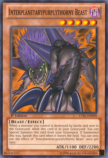 When a monster you control is destroyed by battle and sent to the Graveyard, while this card is in the Graveyard: You can Special Summon this card from your Graveyard. If Summoned this way, banish this card when it leaves the field. You can only use the effect of "Interplanetarypurplythorny Beast" once per turn.
