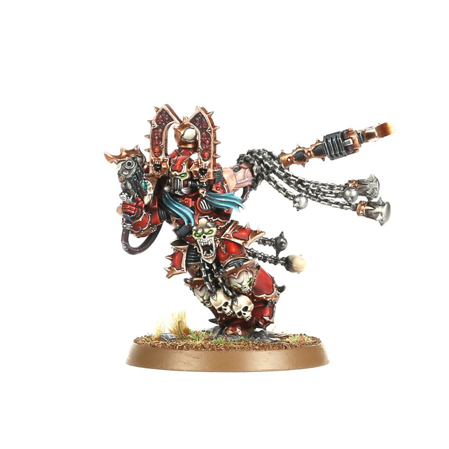 This multipart plastic kit builds Khârn the Betrayer, an iconic champion of the Blood God and his World Eaters Legion. Toting a destructive plasma pistol of ancient design, Khârn swings Gorechild, the savage chainaxe once wielded by his father Angron. His terrifying war-helm sports the classic Berzerker crests, while swinging chains, skull-trophies, and tassels convey the sheer ferocity of his charge. Khârn leads by frenzied example, his very presence inspiring his warriors to even greater feats of bloodshed – if he doesn't slay them himself...