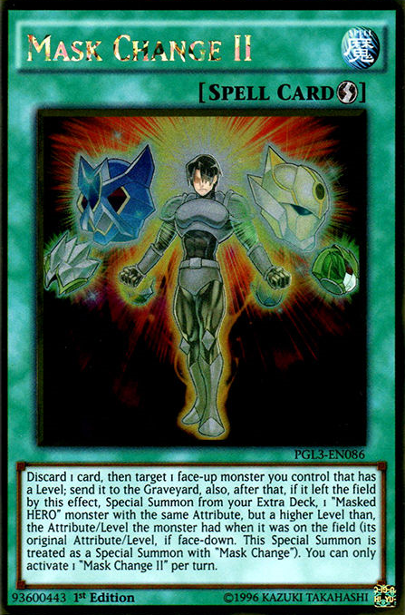 Discard 1 card, then target 1 face-up monster you control that has a Level; send it to the Graveyard, also, after that, if it left the field by this effect, Special Summon from your Extra Deck, 1 "Masked HERO" monster with the same Attribute, but a higher Level than, the Attribute/Level the monster had when it was on the field (its original Attribute/Level, if face-down. This Special Summon is treated as a Special Summon with "Mask Change"). You can only activate 1 "Mask Change II" per turn.