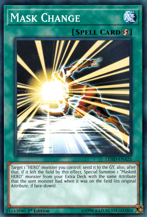 Target 1 "HERO" monster you control; send it to the GY, also, after that, if it left the field by this effect, Special Summon 1 "Masked HERO" monster from your Extra Deck with the same Attribute that the sent monster had when it was on the field (its original Attribute, if face-down).
