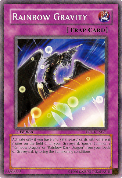 Activate only if you have 7 "Crystal Beast" cards with different names on the field or in your Graveyard. Special Summon 1 "Rainbow Dragon" or "Rainbow Dark Dragon" from your Deck or Graveyard, ignoring the Summoning conditions.