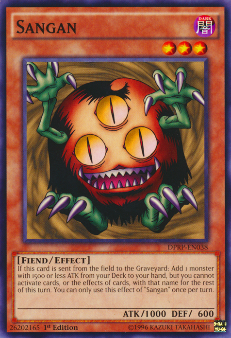If this card is sent from the field to the Graveyard: Add 1 monster with 1500 or less ATK from your Deck to your hand, but you cannot activate cards, or the effects of cards, with that name for the rest of this turn. You can only use this effect of "Sangan" once per turn.