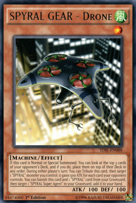 If this card is Normal or Special Summoned: You can look at the top 3 cards of your opponent's Deck, and if you do, place them on top of their Deck in any order. During either player's turn: You can Tribute this card, then target 1 "SPYRAL" monster you control; it gains 500 ATK for each card your opponent controls. You can banish this card and 1 "SPYRAL" card from your Graveyard, then target 1 "SPYRAL Super Agent" in your Graveyard; add it your hand.