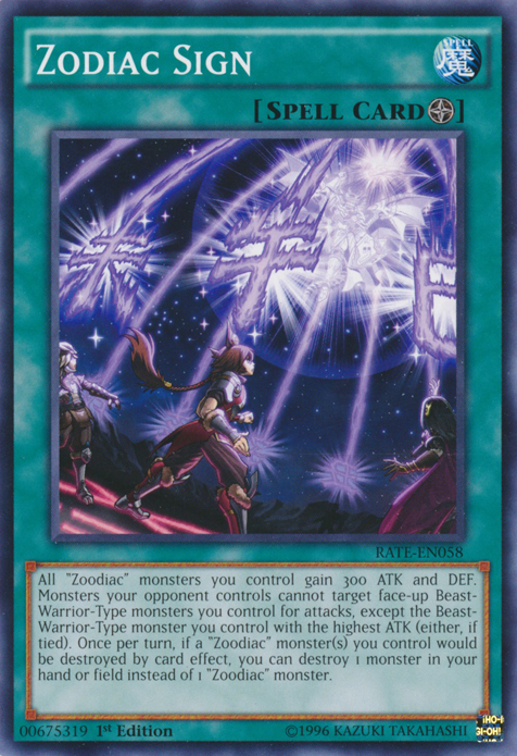 All "Zoodiac" monsters you control gain 300 ATK and DEF. Monsters your opponent controls cannot target face-up Beast-Warrior-Type monsters you control for attacks, except the Beast-Warrior-Type monster you control with the highest ATK (either, if tied). Once per turn, if a "Zoodiac" monster(s) you control would be destroyed by card effect, you can destroy 1 monster in your hand or field instead of 1 "Zoodiac" monster.