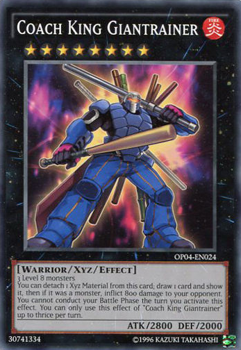 You can detach 1 Xyz Material from this card; draw 1 card and show it, then if it was a monster, inflict 800 damage to your opponent. You cannot conduct your Battle Phase the turn you activate this effect. You can only use this effect of "Coach King Giantrainer" up to thrice per turn.