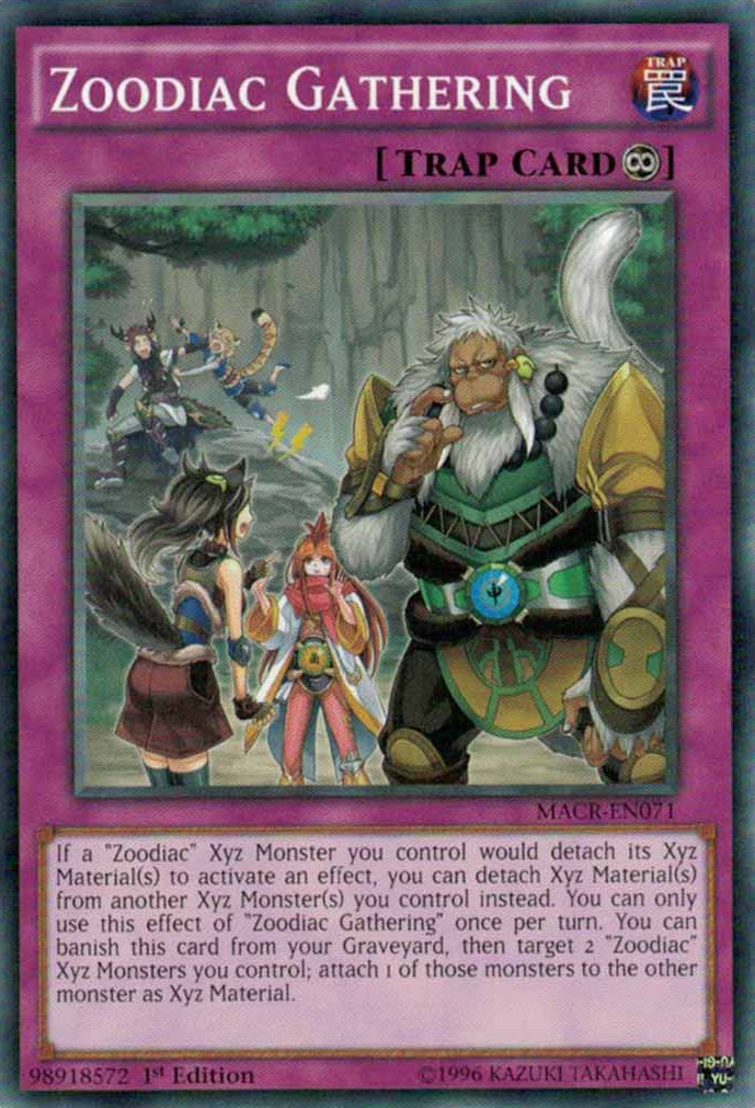 If a "Zoodiac" Xyz Monster you control would detach its Xyz Material(s) to activate an effect, you can detach Xyz Material(s) from another Xyz Monster(s) you control instead. You can only use this effect of "Zoodiac Gathering" once per turn. You can banish this card from your Graveyard, then target 2 "Zoodiac" Xyz Monsters you control; attach 1 of those monsters to the other monster as Xyz Material.