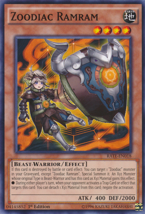 If this card is destroyed by battle or card effect: You can target 1 "Zoodiac" monster in your Graveyard, except "Zoodiac Ramram"; Special Summon it. An Xyz Monster whose original Type is Beast-Warrior and has this card as Xyz Material gains this effect. •During either player's turn, when your opponent activates a Trap Card or effect that targets this card: You can detach 1 Xyz Material from this card; negate the activation.