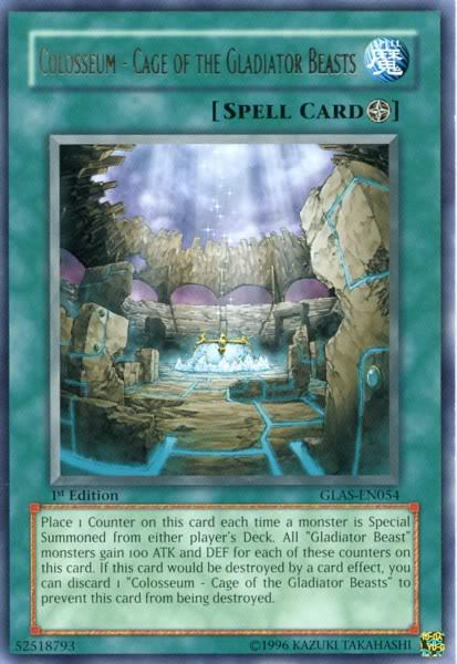 Place 1 counter on this card each time a monster is Special Summoned from either player's Deck. All "Gladiator Beast" monsters gain 100 ATK and DEF for each of these counters on this card. If this card would be destroyed by a card effect, you can discard 1 "Colosseum - Cage of the Gladiator Beasts" to prevent this card from being destroyed.