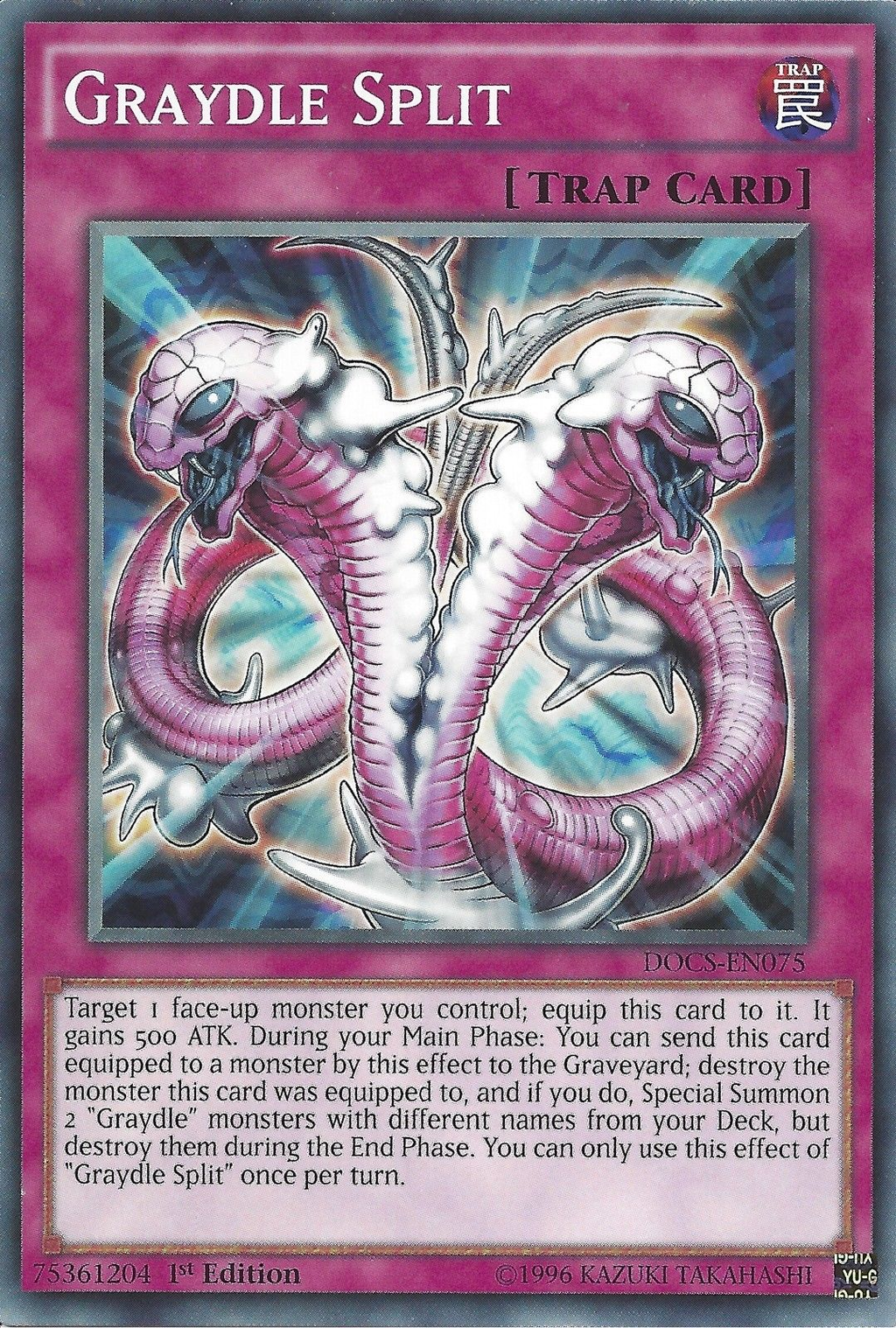 Target 1 face-up monster you control; equip this card to it. It gains 500 ATK. During your Main Phase: You can send this card equipped to a monster by this effect to the Graveyward; destroy the monster this card was equipped to, and if you do, Special Summon 2 "Graydle" monsters with different names from your Deck, but destroy them during the End Phase. You can only use this effect of "Graydle Split" once per turn.