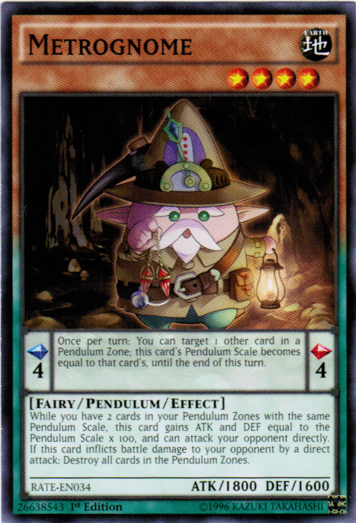 While you have 2 cards in your Pendulum Zones with the same Pendulum Scale, this card gains ATK and DEF equal to the Pendulum Scale x 100, and can attack your opponent directly. If this card inflicts battle damage to your opponent by a direct attack: Destroy all cards in the Pendulum Zones.