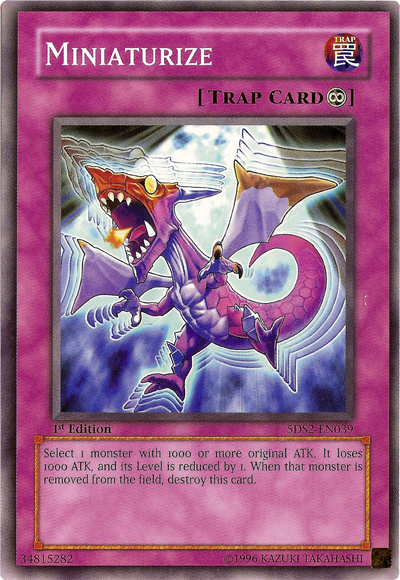 Select 1 monster with 1000 or more original ATK. It loses 1000 ATK, and its Level is reduced by 1. When that monster is removed from the field, destroy this card.