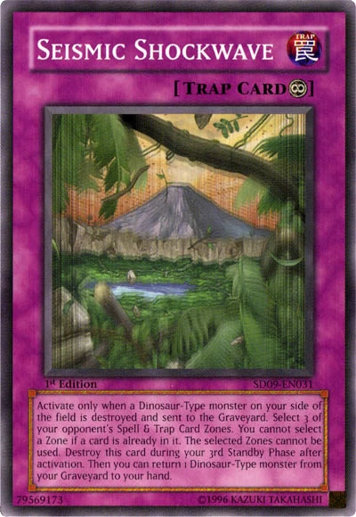 Activate only when a Dinosaur-Type monster on your side of the field is destroyed and sent to the Graveyard. Select 3 of your opponent's Spell & Trap Card Zones. You cannot select a Zone if a card is already in it. The selected Zones cannot be used. Destroy this card during your 3rd Standby Phase after activation. Then you can return 1 Dinosaur-Type monster from your Graveyard to your hand.
