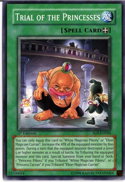 You can only equip this card to "White Magician Pikeru" or "Ebon Magician Curran". Increase the ATK of the equipped monster by 800 points. During a turn that the equipped monster destroyed a Level 5 or higher monster as a result of battle, by Tributing the equipped monster and this card, Special Summon from your hand or Deck: 1 "Princess Pikeru" if you Tributed "White Magician Pikeru", or 1 "Princess Curran" if you Tributed "Ebon Magician Curran".