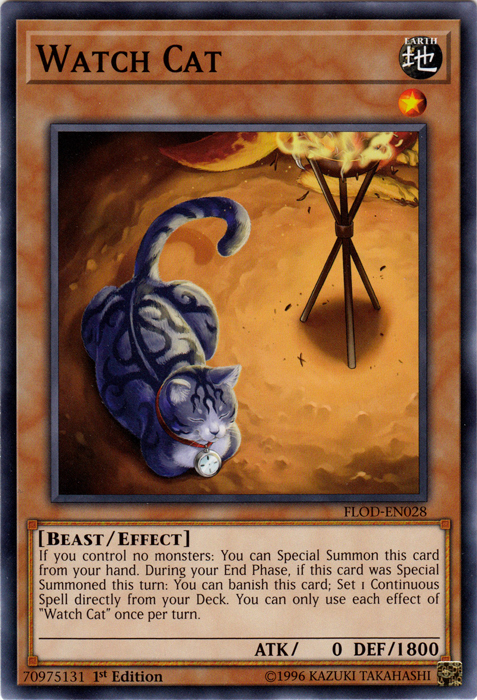 If you control no monsters: You can Special Summon this card from your hand. During your End Phase, if this card was Special Summoned this turn: You can banish this card; Set 1 Continuous Spell directly from your Deck. You can only use each effect of "Watch Cat" once per turn.