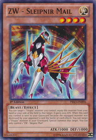 You can target 1 "Utopia" monster you control; equip this monster from your hand or your side of the field to that target. It gains 1000 ATK. When this card you control is sent to your Graveyard because the equipped monster was destroyed by your opponent's card (by battle or card effect): You can target 1 "Utopia" monster in your Graveyard; Special Summon that target. You can only control 1 "ZW - Sleipnir Mail".