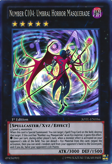 4 level 5 monsters When this card is Special Summoned: You can target 1 Spell/Trap Card on the field; destroy that target. If this card has "Number 104: Masquerade" as an Xyz Material, it gains this effect. •Once per turn, during either player's turn, when a monster effect is activated on your opponent's side of the field: You can detach 1 Xyz Material from this card; negate the activation, then you can send 1 random card from your opponent's hand to the Graveyard, and if you do, halve your opponent's Life Points.