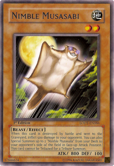 When this card is destroyed by battle and sent to the Graveyard, inflict 500 damage to your opponent. You can Special Summon up to 2 "Nimble Musasabi" from your Deck to you opponent's side of the field in face-up Attack Position. This card cannot be Tributed for a Tribute Summon.