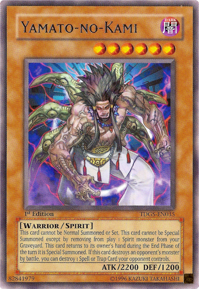 This card cannot be Normal Summoned or Set. This card cannot be Special Summoned except by removing from play 1 Spirit Monster in your Graveyard. This card returns to the owner's hand during the End Phase of the turn that this card is Special Summoned. If this card destroys a monster by battle, you may destroy 1 Spell or Trap Card your opponent controls.