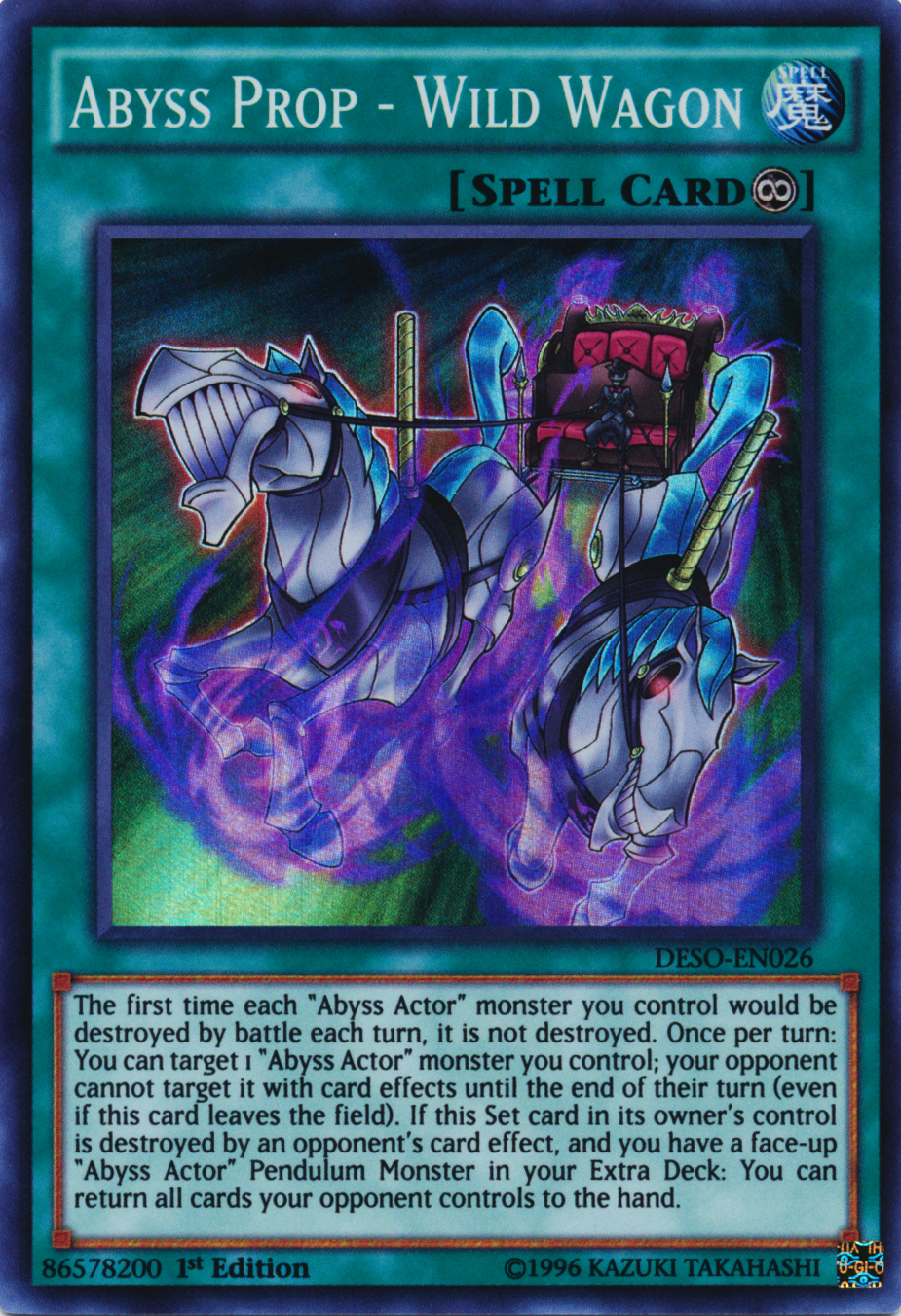 The first time each "Abyss Actor" monster you control would be destroyed by battle each turn, it is not destroyed. Once per turn: You can target 1 "Abyss Actor" monster you control; your opponent cannot target it with card effects until the end of their turn (even if this card leaves the field). If this Set card in its owner's control is destroyed by an opponent's card effect, and you have a face-up "Abyss Actor" Pendulum Monster in your Extra Deck: You can return all cards your opponent controls to the hand.