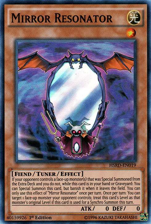 If your opponent control a face-up monster(s) that was Special Summoned from the Extra Deck and you do not, while this card is in your hand or Graveyard: You can Special Summon this card, but banish it when it leaves the field. You can only use this effect of "Mirror Resonator" once per turn. Once per turn: You can target 1 face-up monster your opponent controls; treat this card's Level as that monster's original Level if this card is used as a Synchro Summon this turn.