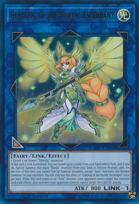 1 Level 5 or lower "Nordic" monster If this card is Link Summoned: You can banish up to 3 cards from your hand and/or field, and if you do, Special Summon that many "Nordic" monsters from your Deck in Defense Position, also, for the rest of this turn, you cannot Special Summon monsters, except "Aesir" monsters, nor Normal Summon/Set any monsters. You can only use this effect of "Gullveig of the Nordic Ascendant" once per turn. While this card points to an "Aesir" monster, your opponent cannot target that monster with card effects, also monsters your opponent controls cannot target this card for attacks.
