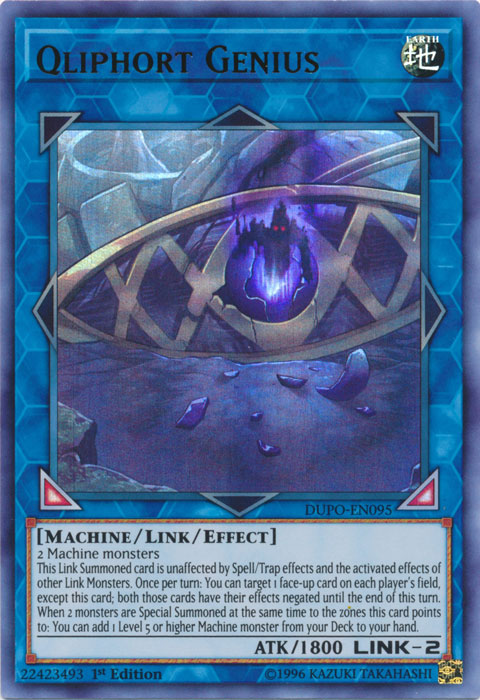 This Link Summoned card is unaffected by Spell/Trap effects and the activated effects of other Link Monsters. Once per turn: You can target 1 face-up card on each player's field, except this card; both those cards have their effects negated until the end of this turn. When 2 monsters are Special Summoned at the same time to the zones this card points to: You can add 1 Level 5 or higher Machine monster from your Deck to your hand.