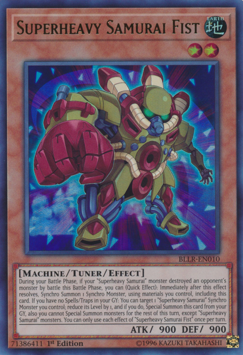 During your Battle Phase, if your "Superheavy Samurai" monster destroyed an opponent's monster by battle this Battle Phase, you can (Quick Effect): Immediately after this effect resolves, Synchro Summon 1 Synchro Monster, using materials you control, including this card. If you have no Spells/Traps in your GY: You can target 1 "Superheavy Samurai" Synchro Monster you control; reduce its Level by 1, and if you do, Special Summon this card from your GY, also you cannot Special Summon monsters for the rest of this turn, except "Superheavy Samurai" monsters. You can only use each effect of "Superheavy Samurai Fist" once per turn.