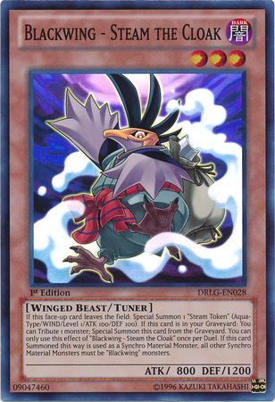 If this face-up card leaves the field: Special Summon 1 "Steam Token" (Aqua/WIND/Level 1/100 ATK/100 DEF). If this card is in your Graveyard: You can Tribute 1 monster; Special Summon this card from the Graveyard. You can only use this effect of "Blackwing - Steam the Cloak" once per Duel. If this card Summoned this way is used as a Synchro Material Monster, all other Synchro Material Monsters must be "Blackwing" monsters.
