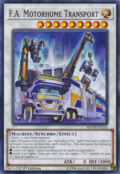1 Tuner + 1+ non-Tuner monsters Gains ATK equal to its Level x 300. Each time a "F.A." Spell/Trap Card or effect is activated: You can increase the Level of this card by 1. This card gains the following effect(s), based on its current Level. • Level 11 or higher: Cannot be destroyed by battle or card effects. • Level 13 or higher: Once per turn: You can target 1 "F.A." monster in your GY; Special Summon it.