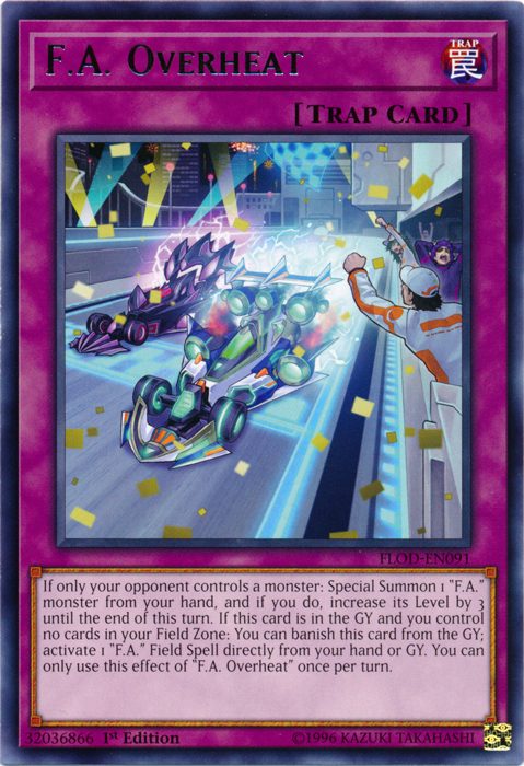 If only your opponent controls a monster: Special Summon 1 "F.A." monster from your hand, and if you do, increase it's Level by 3 until the end of this turn. If this card is in the GY and you control no cards in your Field Zone: You can banish this card from the GY; activate 1 "F.A." Field Spell directly from your hand or GY. You can only use this effect of “F.A. Overheat” once per turn.