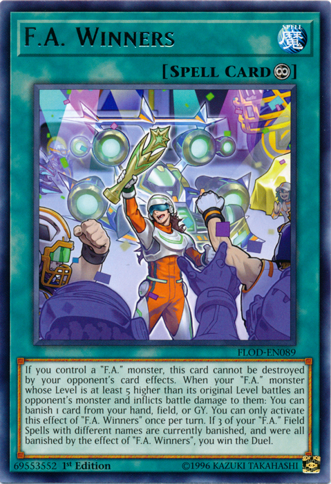 If you control a "F.A." monster, this card cannot be destroyed by your opponent's card effects. When your "F.A." monster whose Level is at least 5 higher than its original Level battles an opponent's monster and inflicts battle damage to them: You can banish 1 card from your hand, field, or GY. You can only activate this effect of "F.A. Winners" once per turn. If 3 of your "F.A." Field Spells with different names are currently banished, and were all banished by the effect of "F.A. Winners", you win the Duel.
