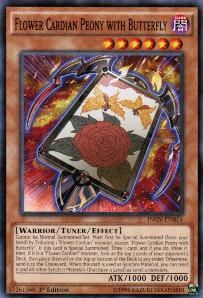 Cannot be Normal Summoned/Set. Must first be Special Summoned (from your hand) by Tributing 1 "Flower Cardian" monster, except "Flower Cardian Peony with Butterfly". If this card is Special Summoned: Draw 1 card, and if you do, show it, then, if it is a "Flower Cardian" monster, look at the top 3 cards of your opponent's Deck, then place them all on the top or bottom of the Deck in any order. Otherwise, send it to the Graveyard. When this card is used as Synchro Material, you can treat it and all other Synchro Materials (that have a Level) as Level 2 monsters.