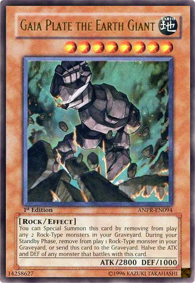 You can Special Summon this card by removing from play any 2 Rock-Type monsters in your Graveyard. During your Standby Phase, remove from play 1 Rock-Type monster in your Graveyard, or send this card to the Graveyard. Halve the ATK and DEF of any monster that battles with this card.
