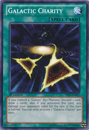 If you control a "Galaxy" Xyz Monster: Discard 1 card; draw 2 cards, also if you activate this card, any damage your opponent takes for the rest of this turn is halved. You can only activate 1 "Galactic Charity" per turn.