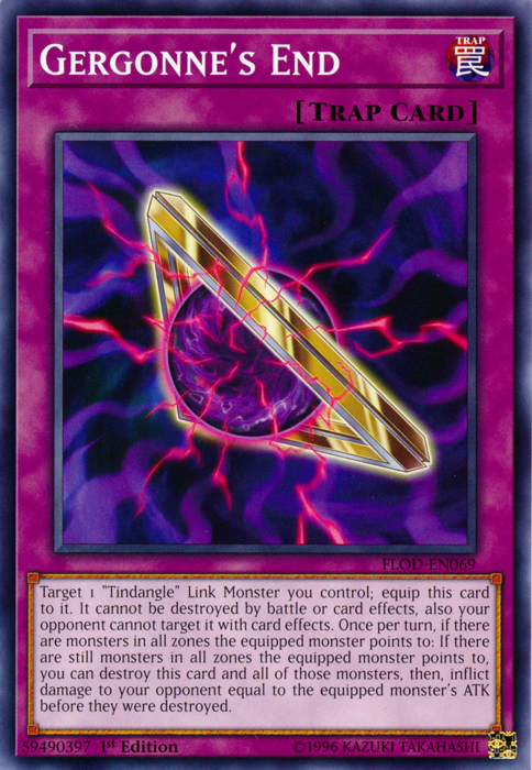 Target 1 "Tindangle" Link Monster you control; equip this card to it. It cannot be destroyed by battle or card effects, also your opponent cannot target it with card effects. Once per turn, if there are monsters in all zones the equipped monster points to: If there are still monsters in all zones the equipped monster points to, you can destroy this card and all of those monsters, then, inflict damage to your opponent equal to the equipped monster's ATK before they were destroyed.