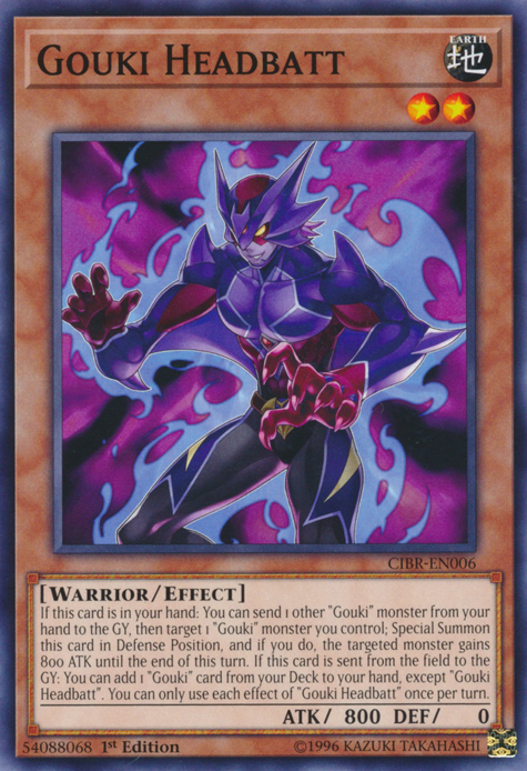 If this card is in your hand: You can send 1 other "Gouki" monster from your hand to the GY, then target 1 "Gouki" monster you control; Special Summon this card in Defense Position, and if you do, the targeted monster gains 800 ATK until the end of this turn. If this card is sent from the field to the GY: You can add 1 "Gouki" card from your Deck to your hand, except "Gouki Headbatt". You can only use each effect of "Gouki Headbatt" once per turn.