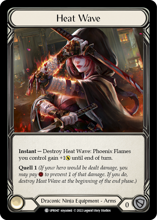 Instant - Destroy Heat Wave: Phoenix Flames you control gain +1{p} until end of turn. Quell 1 (If your hero would be dealt damage, you may pay {r} to prevent 1 of that damage. If you do, destroy Heat Wave at the beginning of the end phase.)