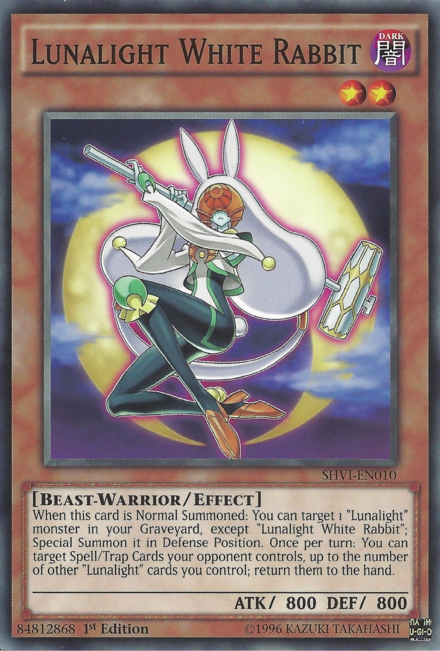 When this card is Normal Summoned: You can target 1 "Lunalight" monster in your Graveyard, except "Lunalight White Rabbit"; Special Summon it in Defense Position. Once per turn: You can target Spell/Trap Cards your opponent controls, up to the number of other "Lunalight" cards you control; return them to the hand.