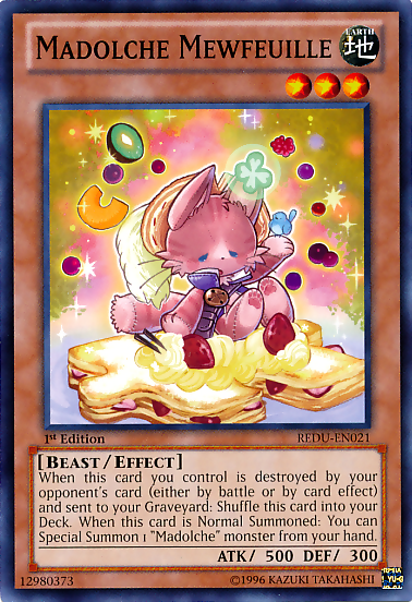 When this card you control is destroyed by your opponent's card (either by battle or by card effect) and sent to your Graveyard: Shuffle this card into your Deck. When this card is Normal Summoned: You can Special Summon 1 "Madolche" monster from your hand.