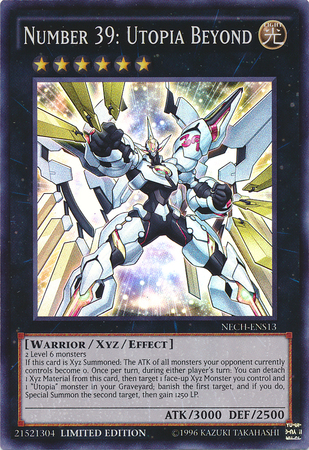 If this card is Xyz Summoned: The ATK of all monsters your opponent currently controls becomes 0. Once per turn, during either player's turn: You can detach 1 Xyz Material from this card, then target 1 face-up Xyz Monster you control and 1 "Utopia" monster in your Graveyard; banish the first target, and if you do, Special Summon the second target from your Graveyard, then gain 1250 LP.
