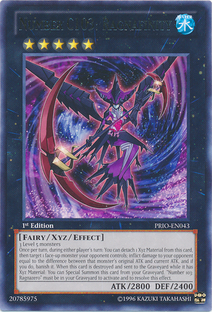 Once per turn, during either player's turn: You can detach 1 Xyz Material from this card, then target 1 face-up monster your opponent controls; inflict damage to your opponent equal to the difference between that monster's original ATK and current ATK, and if you do, banish it. When this card is destroyed and sent to the Graveyard while it has Xyz Material: You can Special Summon this card from your Graveyard. "Number 103: Ragnazero" must be in your Graveyard to activate and to resolve this effect.