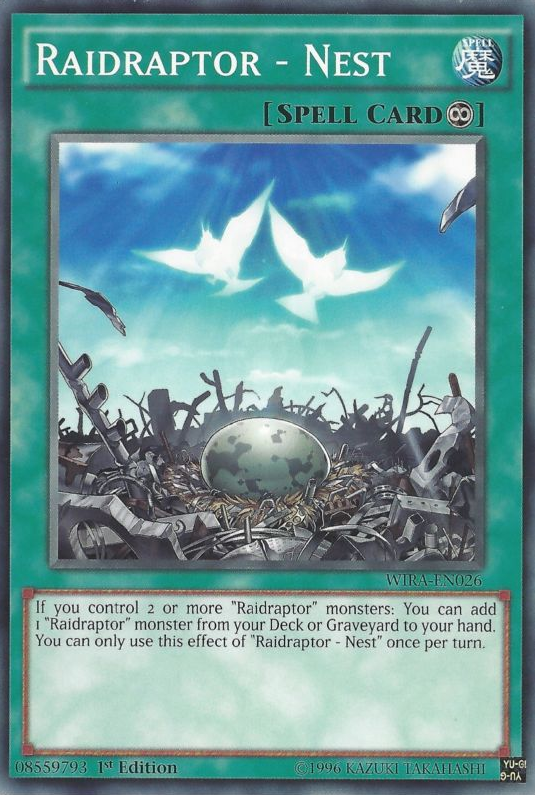If you control 2 or more "Raidraptor" monsters: You can add 1 "Raidraptor" monster from your Deck or Graveyard to your hand. You can only use this effect of "Raidraptor - Nest" once per turn.