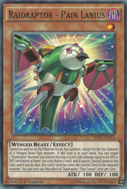 Cannot be used as an Xyz Material for an Xyz Summon, except for the Xyz Summon of a Winged Beast-Type monster. If this card is in your hand: You can target 1 "Raidraptor" monster you control that has a Level; you take damage equal to that monster's ATK or DEF (whichever is lower, but your choice if tied), and if you do, Special Summon this card, and if you do that, this card's Level becomes the current Level of the targeted monster. You can only use this effect of "Raidraptor - Pain Lanius" once per turn.