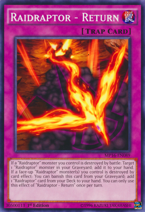 If a "Raidraptor" monster you control is destroyed by battle: Target 1 "Raidraptor" monster in your Graveyard; add it to your hand. If a face-up "Raidraptor" monster(s) you control is destroyed by card effect: You can banish this card from your Graveyard; add 1 "Raidraptor" card from your Deck to your hand. You can only use this effect of "Raidraptor - Return" once per turn.