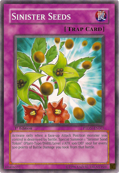 Activate only when a face-up Attack Position monster you control is destroyed by battle. Special Summon 1 "Sinister Seed Token" (Plant-Type/DARK/Level 1/ATK 100/DEF 100) for every 500 points of Battle Damage you took from that battle.