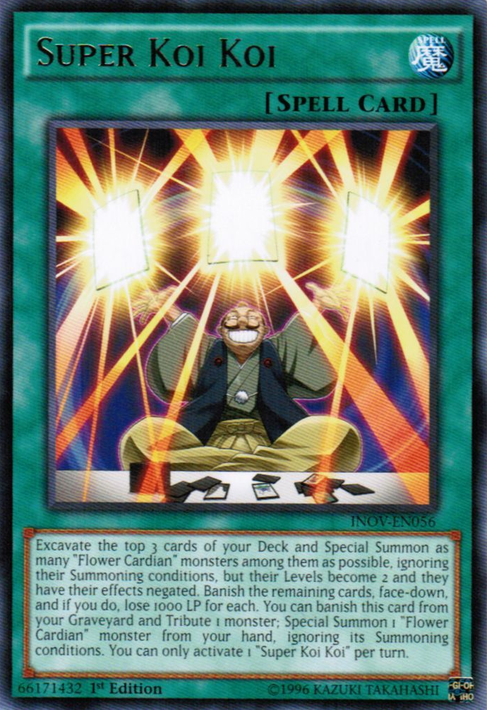 Excavate the top 3 cards of your Deck and Special Summon as many "Flower Cardian" monsters among them as possible, ignoring their Summoning conditions, but their Levels become 2 and they have their effects negated. Banish the remaining cards, face-down, and if you do, lose 1000 LP for each. You can banish this card from your Graveyard and Tribute 1 monster; Special Summon 1 "Flower Cardian" monster from your hand, ignoring its Summoning conditions. You can only activate 1 "Super Koi Koi" per turn.