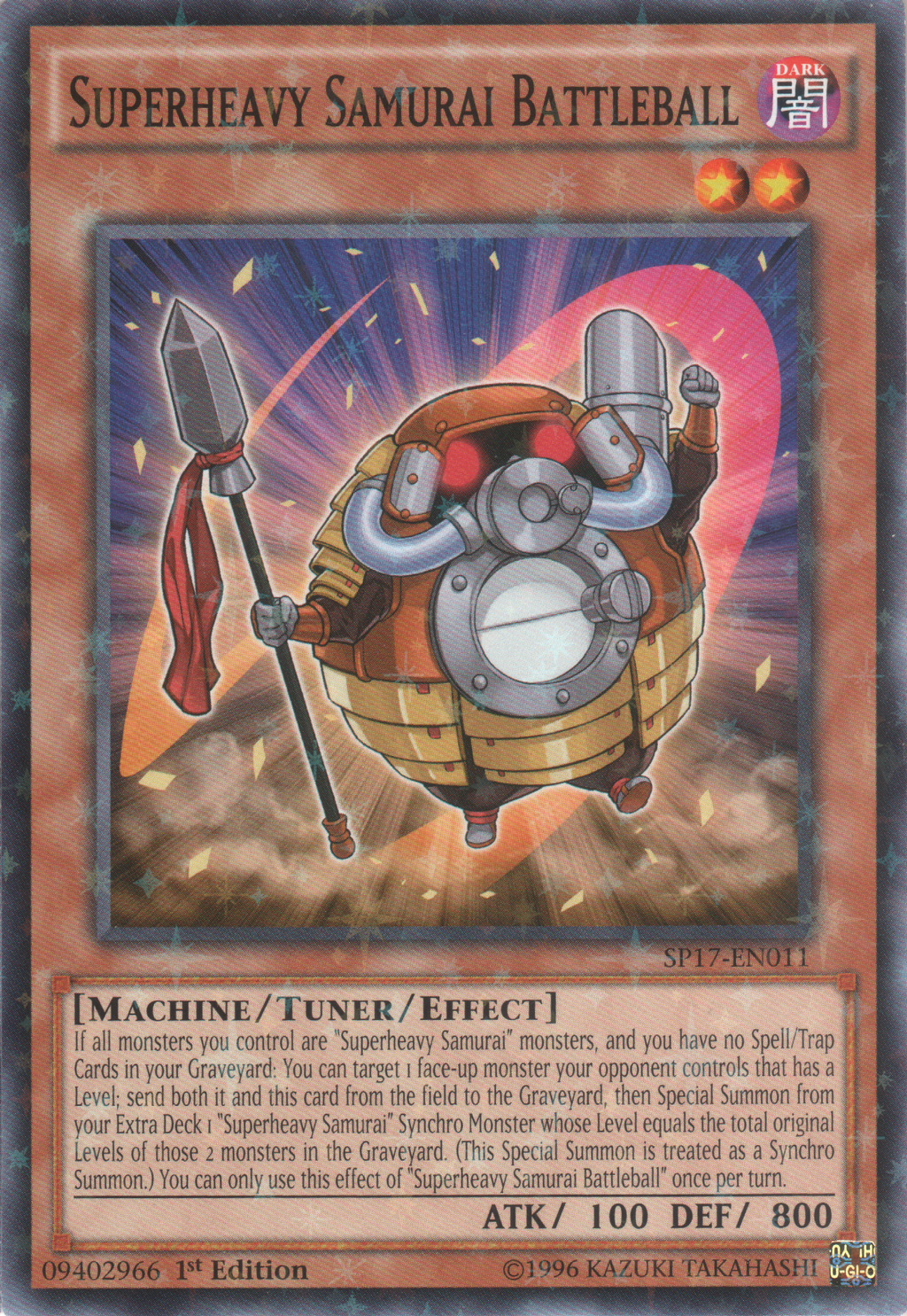 If all monsters you control are "Superheavy Samurai" monsters, and you have no Spell/Trap Cards in your Graveyard: You can target 1 face-up monster your opponent controls that has a Level; send both it and this card from the field to the Graveyard, then Special Summon from your Extra Deck 1 "Superheavy Samurai" Synchro Monster whose Level equals the total original Levels of those 2 monsters in the Graveyard. (This Special Summon is treated as a Synchro Summon.) You can only use this effect of "Superheavy Samurai Battleball" once per turn.